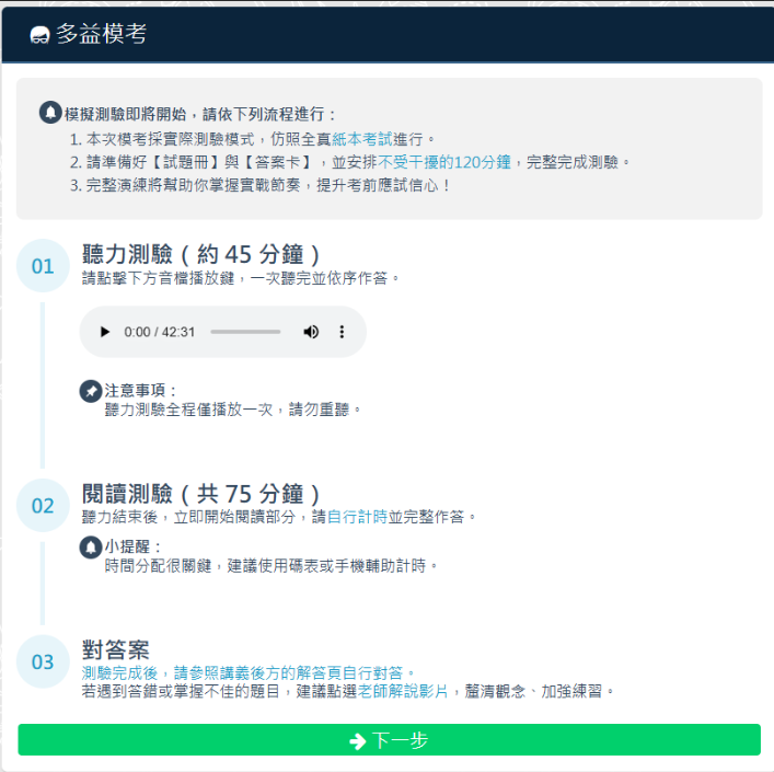 為了讓學生熟悉考試節奏,課程每五堂安排一次全真模擬考,總計四回,考題參考多益官方題本並由 AI 仿寫同規格題目,附紙本考卷與音檔。每題皆提供詳細影音解析,確保學生不只是「做題」,更能理解錯誤原因。