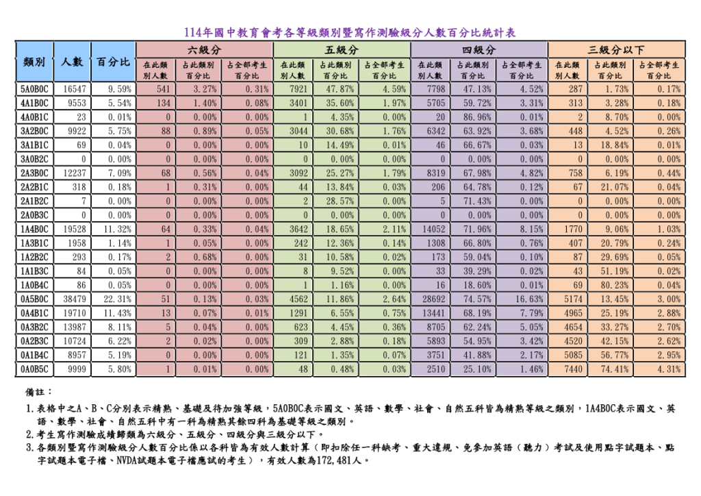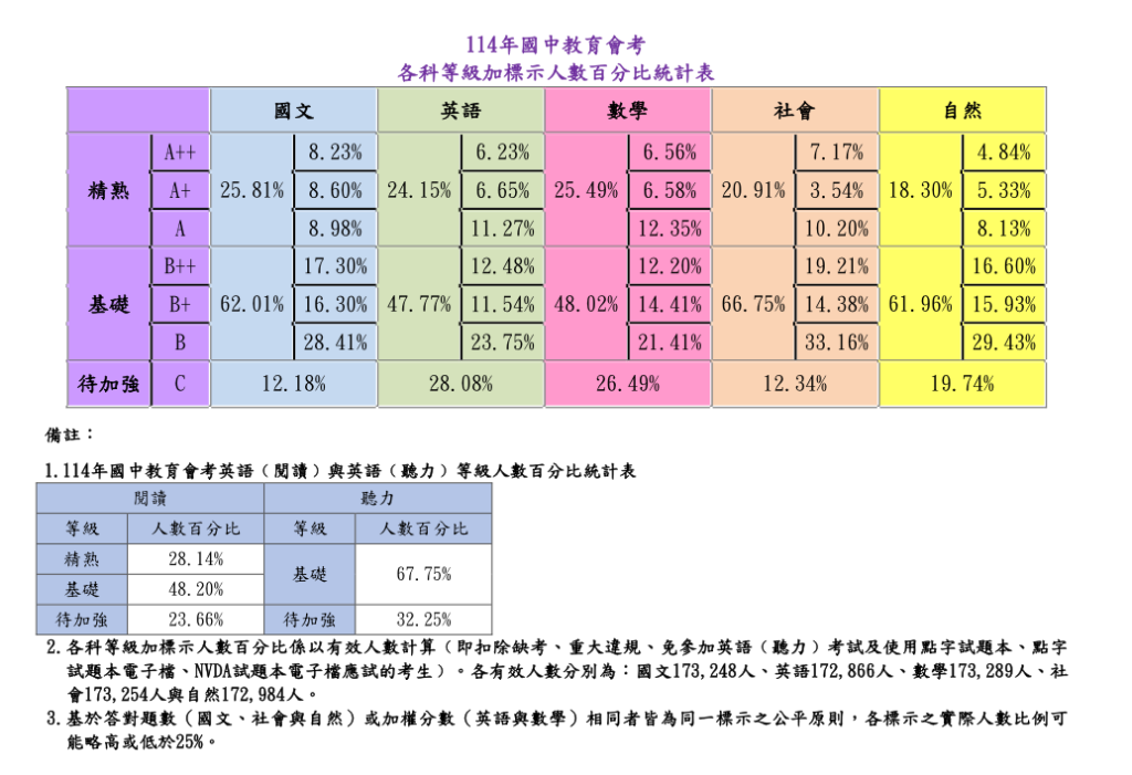 114會考成績查詢開放!114年國中教育會考成績今日正式公告並同步寄發成績單。根據教育部最新資料顯示,今年「五科皆達基礎等級(A級以上)」的學生比例上升至41.2%,創下近五年新高。負責命題與統計的師大心測中心指出,這項趨勢反映出學生整體學習表現穩定成長。教育部也表示,這項進展有賴各地學校持續推動學習扶助與課程優化,並對全國教師的辛勞付出表達肯定。