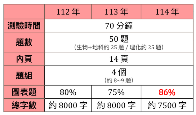 圖表轉譯題目和跨領域文章增加,需要資料整合能力,考核學生運用語文知識分析、解讀圖表與跨學科資訊的能力。