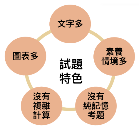 - 因此試題設計也強調素養導向,如同其他科目,結合生活情境和時事議題,重視跨學科的整合應用以及圖表資料的解讀和轉譯能力。