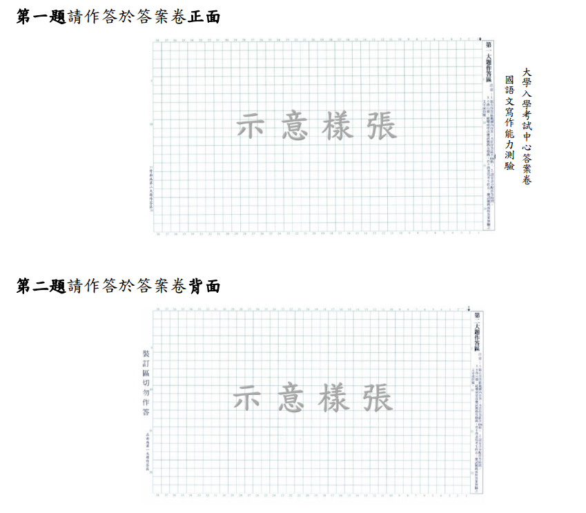- 作答分區規定: 由於評分採「分題閱卷」,考生作答務必遵守答題規則,第一題須作答於「答案卷」正面,第二題須作答於「答案卷」背面。若未遵守規定,例如從第二大題作答區開始寫作第一大題者,將會扣 1 分。稿紙單面約800字,切勿超過稿紙字數。